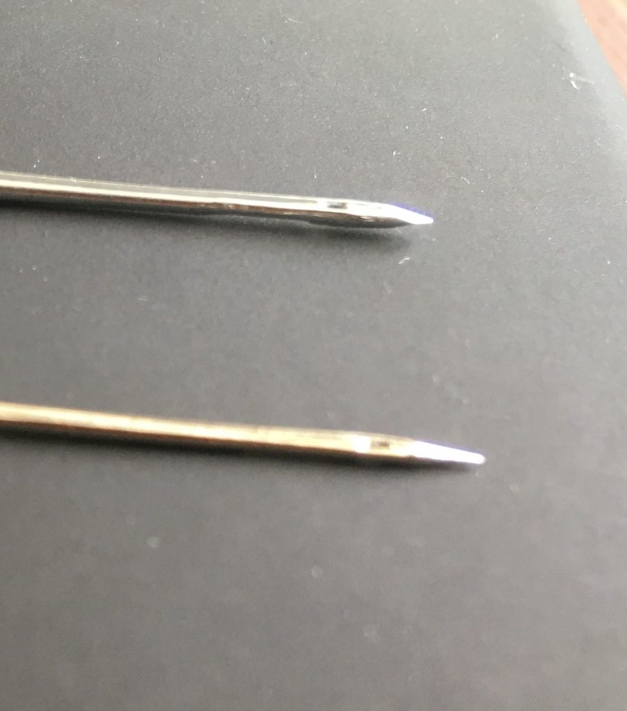 The leather needle is on the left, and the “normal” (“sharp) needle is on the right. The tip of the leather needle is much stronger and thicker (and will make a bigger hole too!!)
